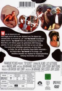 Top Secret verweigert sich fast jeder Beschreibung. Die Action-Story ist in der ostdeutschen Gegenwart angesiedelt, und hier wird ein bekannter Rocksänger in Ereignisse und Abenteuer verwickelt, die auf absonderliche Weise Erinnerungen an die frühen 40er Jahre wachrufen. Natürlich spielt die Liebe in Gestalt der schönen Hillary genauso eine Rolle wie Spannung und mitreissende Rock'n'Roll-Einlagen á la Elvis Presley. Wenn du herumsitzt und dich fragst, ob die Macher von Airplane und The Naked Gun verrückt sind: die Antwort ist Ja. Und Top Secret! Beseitigt den letzten Zweifel. Top Secret! Lässt den amerikanischen Rockstar Nick Rivers gegen die gefürchtete DDR Führung antreten. Es ist ein Lauf gegen die Zeit: Nick tut sich mit Hillary Flammond zusammen, um ihren Vater zu finden. Der will die ultimative Super Waffe entwickeln - die Polaris Mine. Top Secret ist für Kriegs und Elvisfilme dasselbe wie Airplane für Katastrophenfilme. |