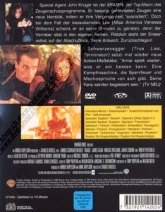 | Special Agent John Kruger ist der ERASER, der Top-Mann des Zeugenschutzprogramms. Er besorgt gefährdeten Zeugen eine neue Identität, indem er ihre Vergangenheit "ausradiert". Doch bei dem Fall der bezaubernden Lee (Miss America Vanessa Williams) scheint er an seine Grenzen zu geraten, denn der Verräter sitzt in den eigenen Reihen. Plötzlich steht der Eraser selbst auf der Abschussliste. Seine Antwort: Zurückschlagen! |